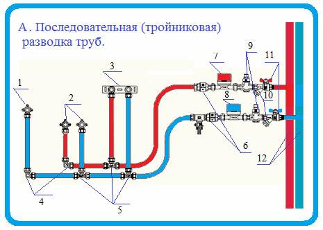 - Тройниковая (последовательная). Подобное подключение – оптимальный вариант для строений с небольшим числом сантехнических приборов и точек водоотвода. Оно предполагает разводку магистральных труб холодного и горячего водоснабжения с последующим отводом дополнительных линий водопотребления. Тройниковая система используется в домах, где не планируются серьезные ремонтные работы и требуется бюджетная организация водоснабжения.