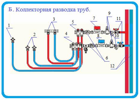 - Коллекторная (лучевая). Данная схема более сложная и отличается наличием двух коллекторов, используемых для холодной и горячей воды, от которых отводятся отдельные трубы к каждому потребителю или водозаборной точке. Подобное решение подходит для домов с большим числом устройств водопотребления, несколькими санузлами и др.